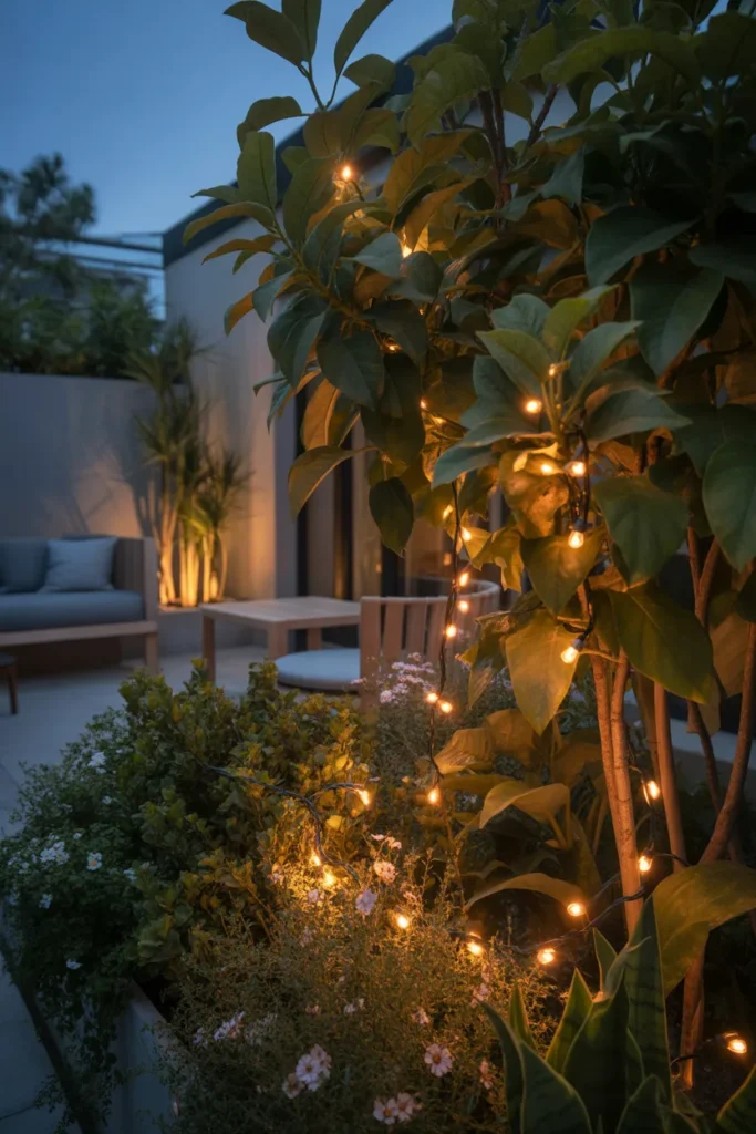 Think warm string lights or small solar lamps tucked between plants. The glow reflects off leaves and creates a cozy evening atmosphere.