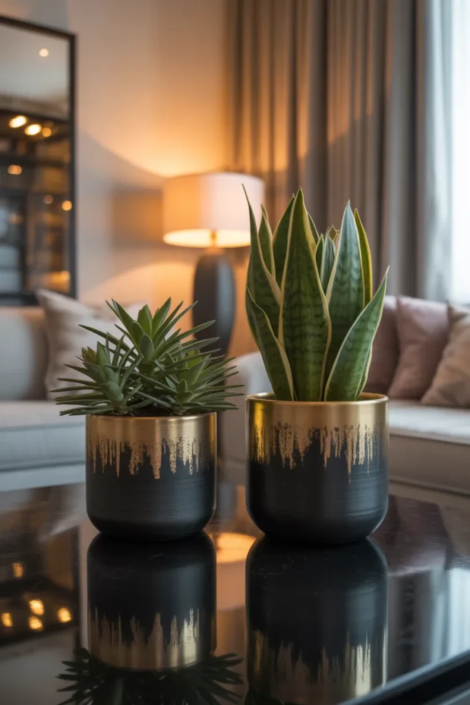 Gold, copper, or bronze accents can instantly elevate a basic pot. Even a simple metallic rim changes the whole vibe.
