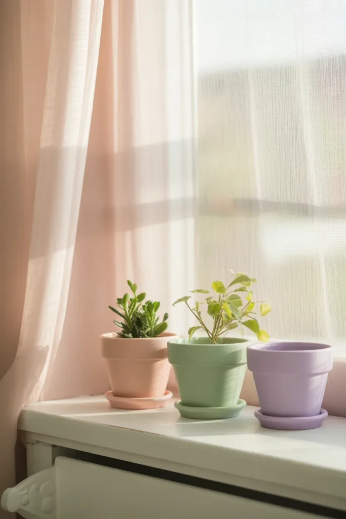 Picture a row of tiny pots sitting on your window ledge, washed in soft morning light. Pale pink, mint green, buttery yellow… nothing loud, just gentle tones that quietly make your space feel lighter.