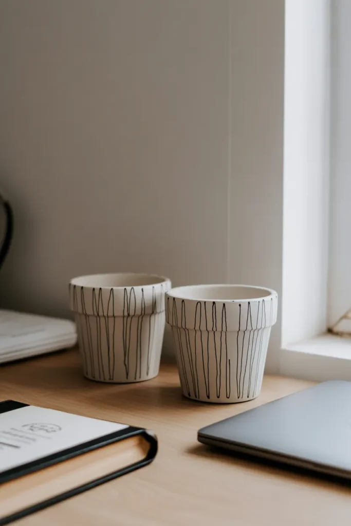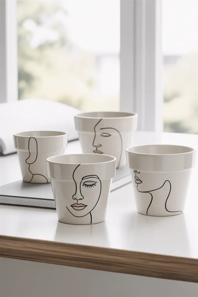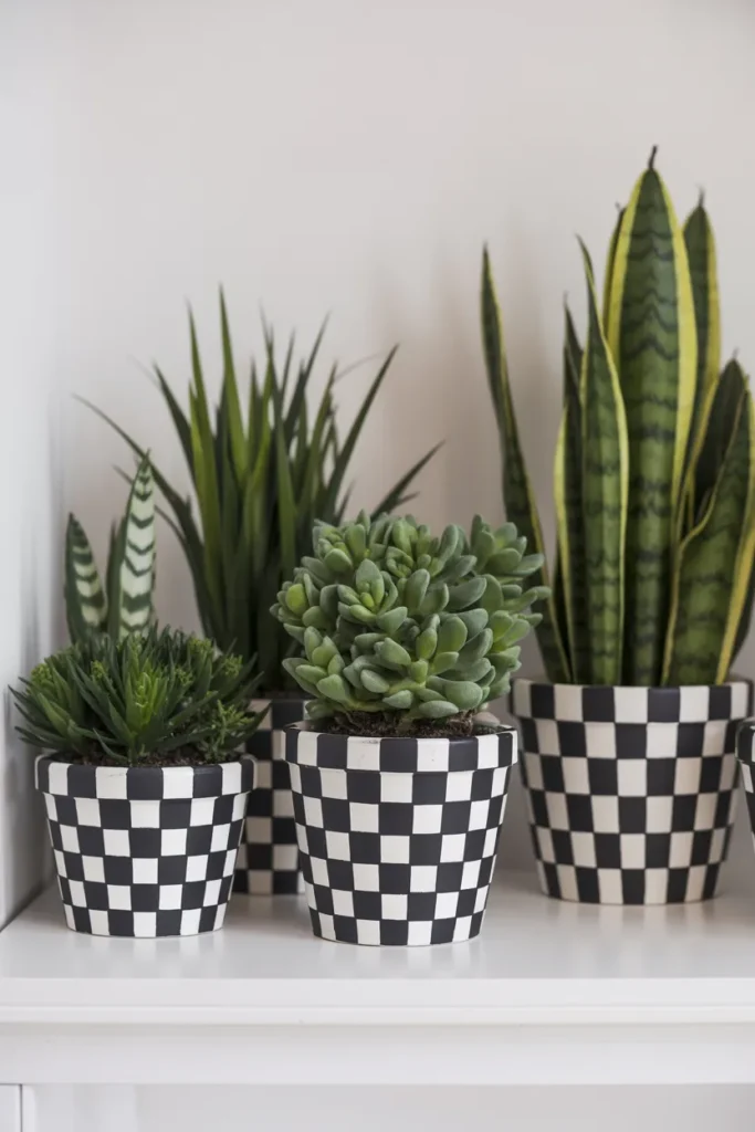 If your style leans clean and uncluttered, black and white pots just feel right. A matte white base with simple black lines or patterns instantly looks elevated.
