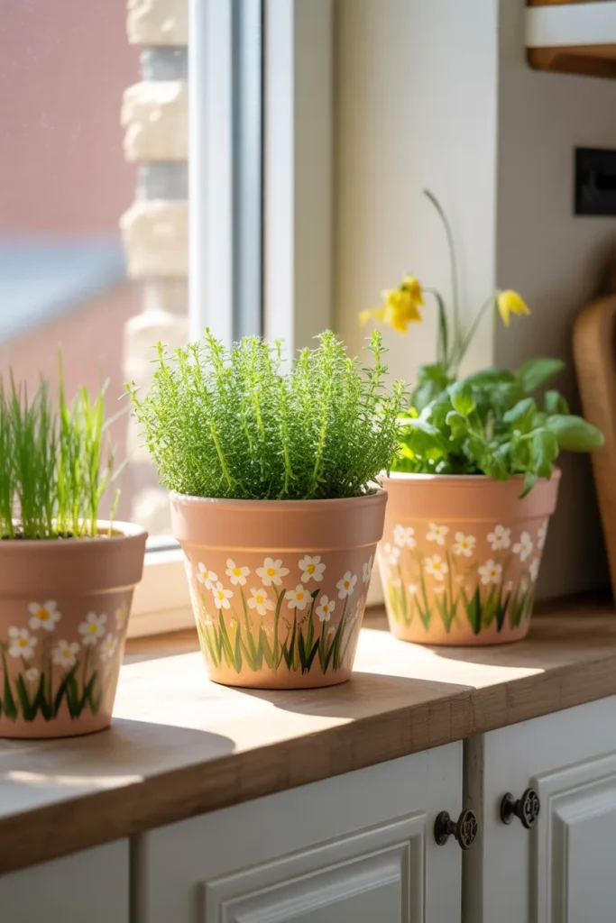 Tiny painted flowers scattered across a pot instantly make it feel cheerful. It’s like bringing a mini garden onto your container.