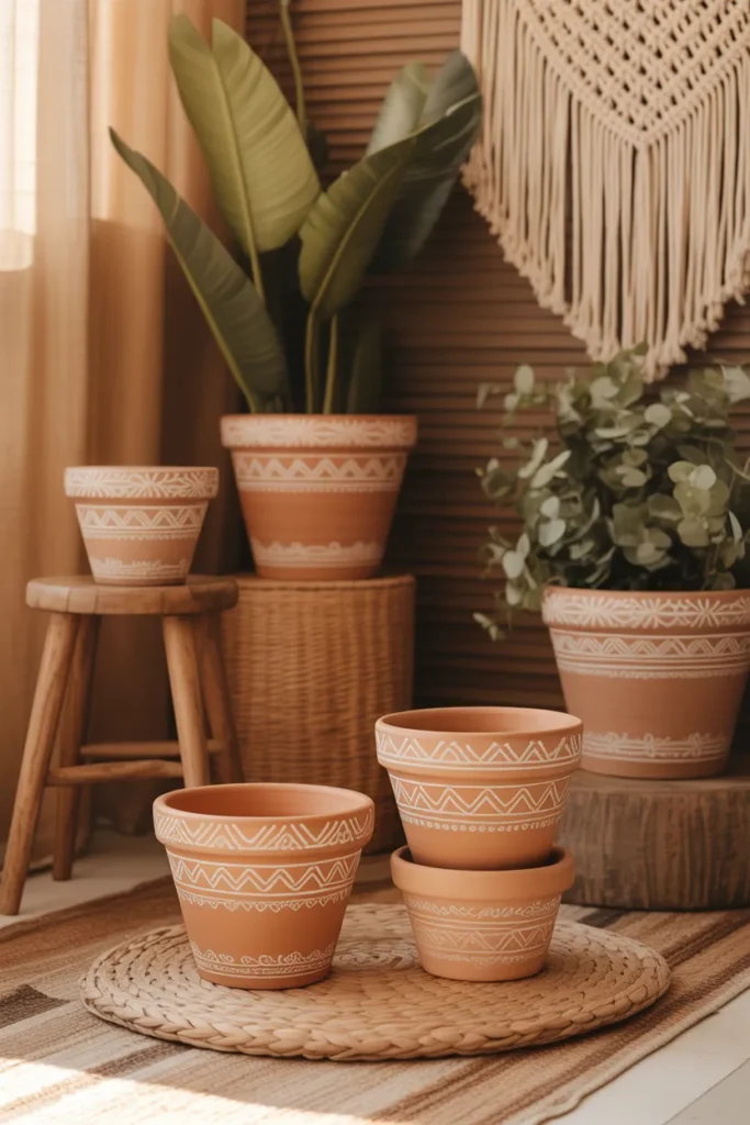 4. Boho Tribal Painted Flower Pots with Earthy Patterns
