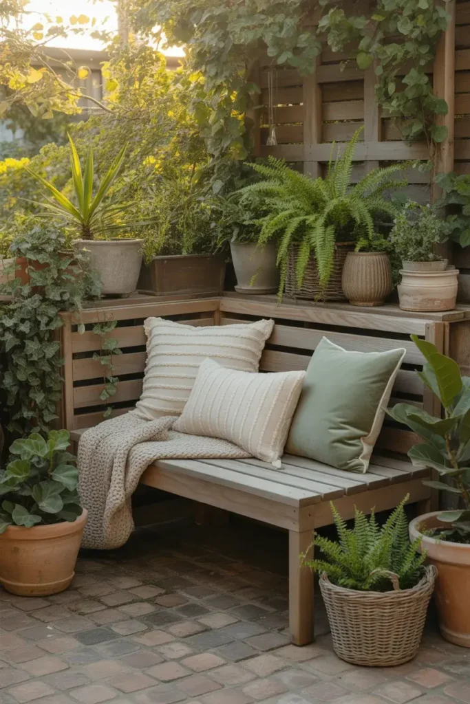 There’s something instantly inviting about a small bench tucked into a leafy corner. Add a cushion, maybe a throw, and suddenly it feels like a hidden escape.