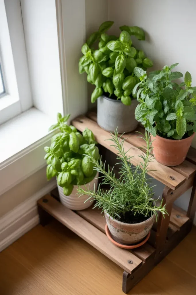 This setup works especially well near a kitchen door or balcony because you’ll actually use it daily. Plus, herbs stay relatively compact, so they won’t overwhelm your corner.