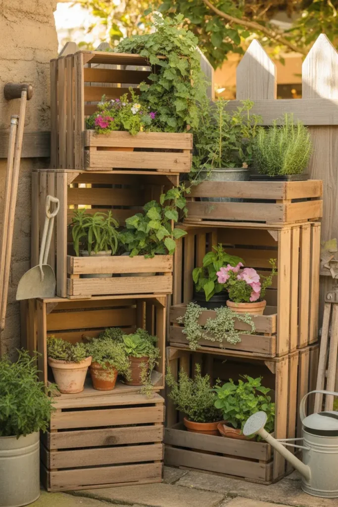Picture this: a few wooden crates stacked casually in the corner, slightly imperfect, holding plants at different levels. It feels relaxed, a little rustic, and not overly designed.