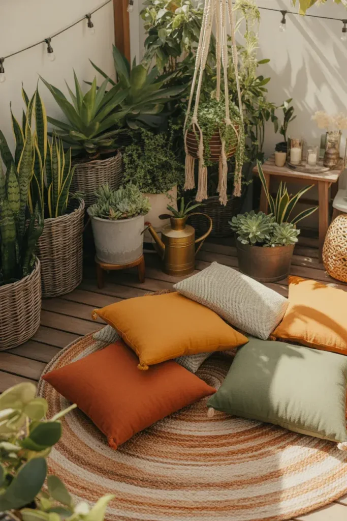 This one feels less like a garden and more like a tiny outdoor living space. A soft rug underfoot, a few layered cushions, and plants framing the edges—it’s relaxed, cozy, and slightly styled without trying too hard.