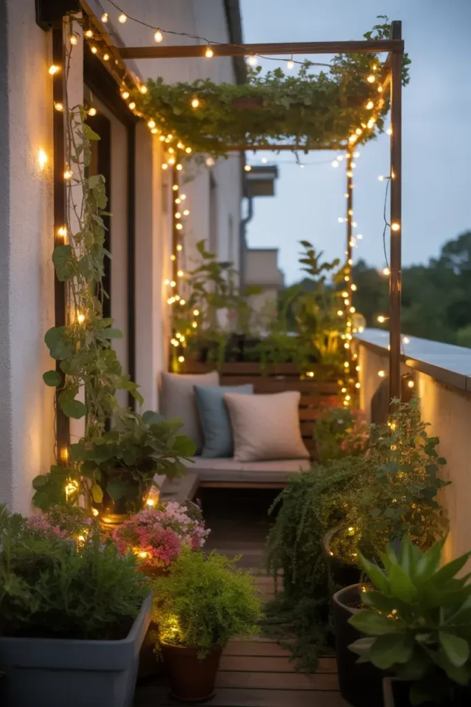 Soft fairy lights draped around plants or along walls create a warm glow that makes the corner feel cozy and inviting—almost like a tiny outdoor retreat.