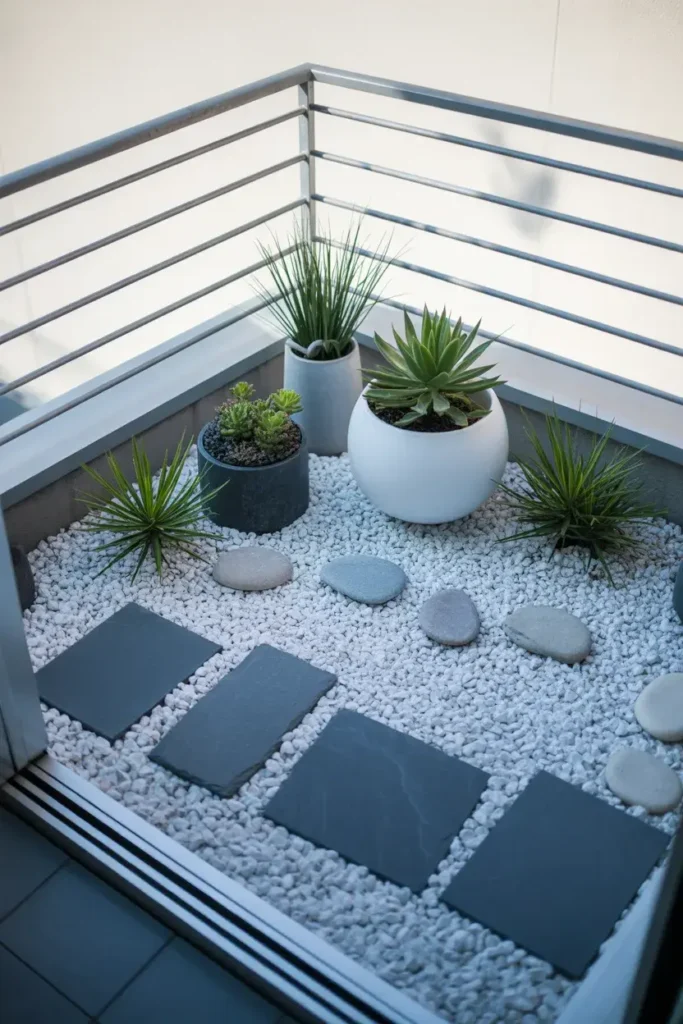 A few smooth stones, one sculptural plant, and clean lines—it feels peaceful and uncluttered, almost like a tiny outdoor retreat.