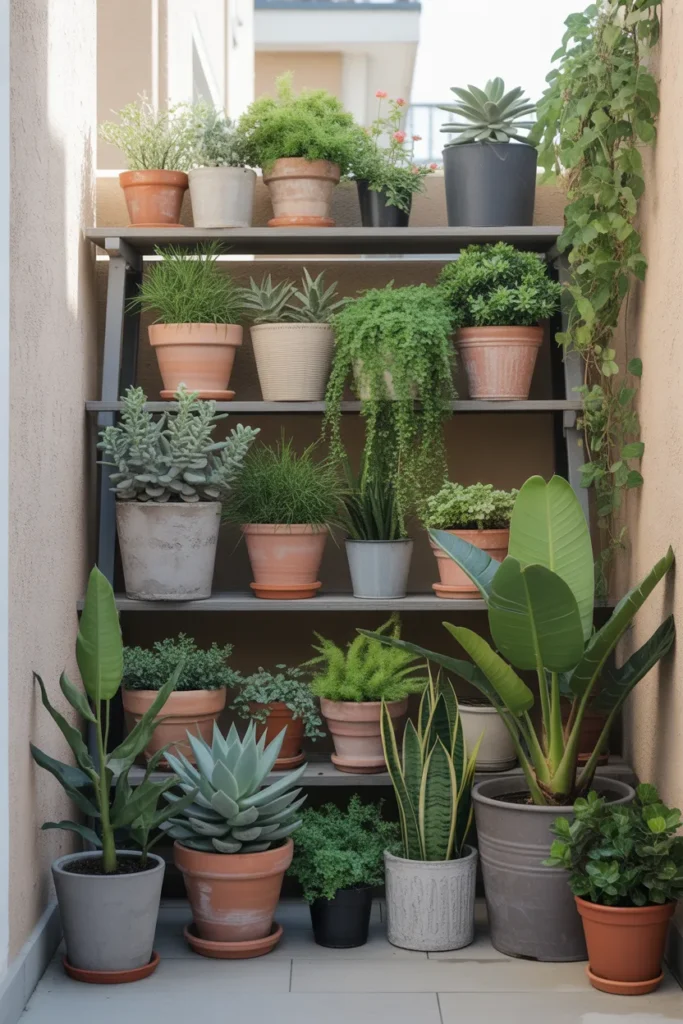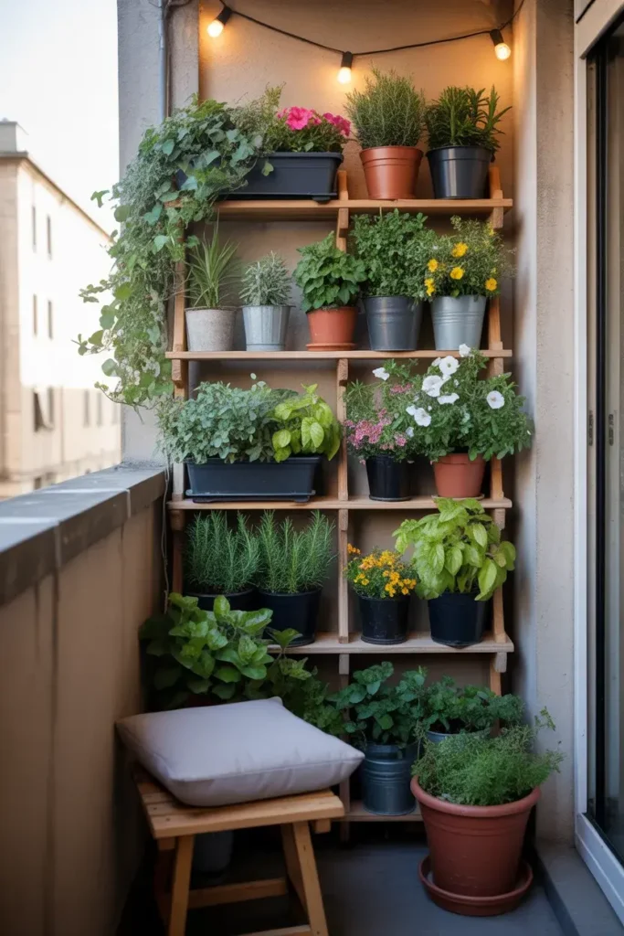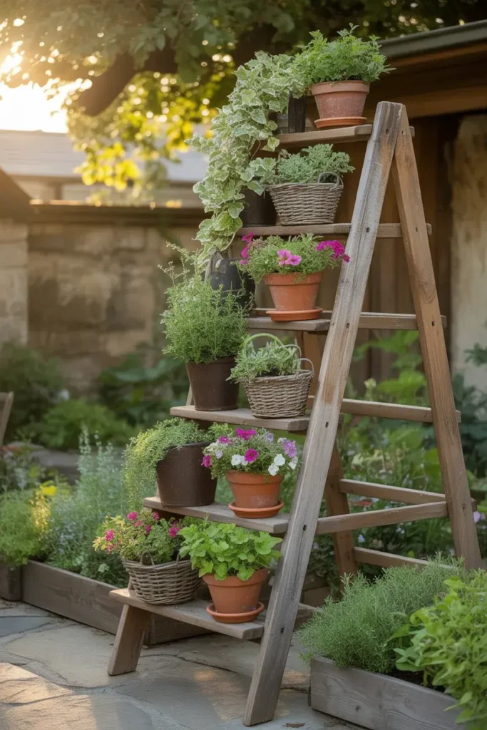 Lean a wooden ladder into the corner and suddenly you have vertical plant space without installing anything.