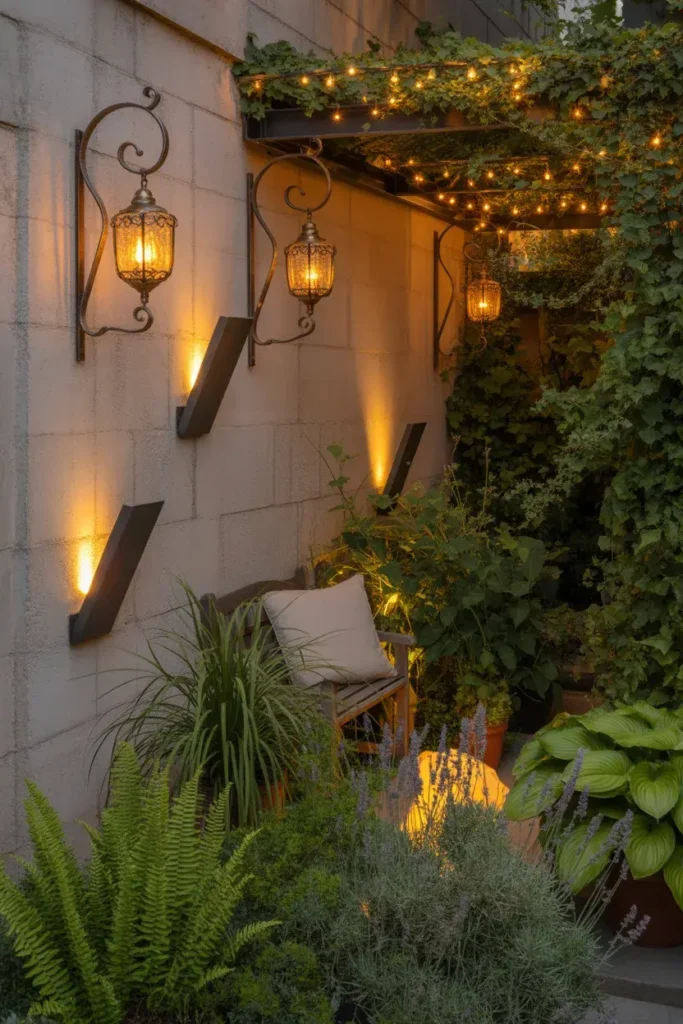 Beyond fairy lights, think soft wall lights or small lanterns highlighting specific plants.