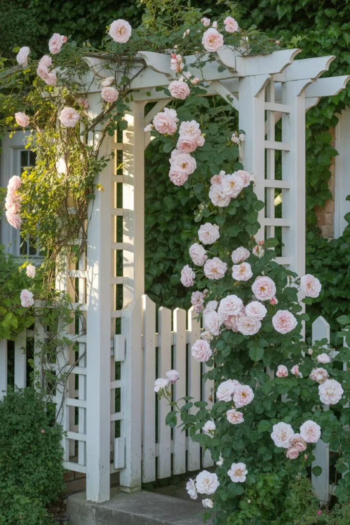 There’s something undeniably romantic about soft pink roses climbing a crisp white trellis. It gives that cottage-core charm without trying too hard.