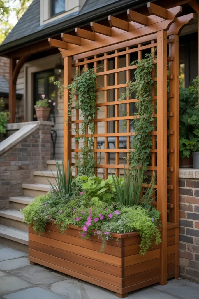 It’s especially useful for those awkward empty corners near steps or entryways that never quite look finished. You can mix trailing plants in the box with climbers going up the trellis, and suddenly that small space feels full and thoughtfully designed.