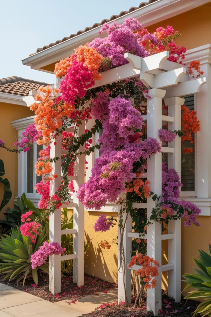 If you want something eye-catching, bougainvillea delivers. The vibrant colors instantly turn your front into a focal point.