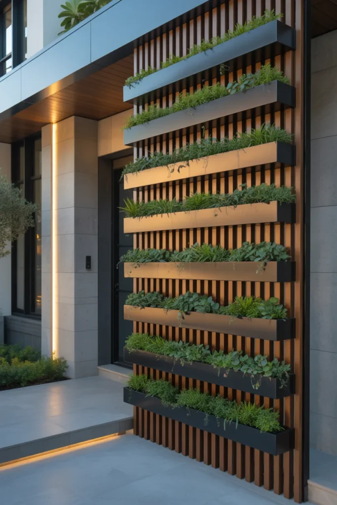 Picture this: dark vertical lines against a neutral wall, with minimal greenery climbing up. It’s clean, bold, and slightly dramatic.