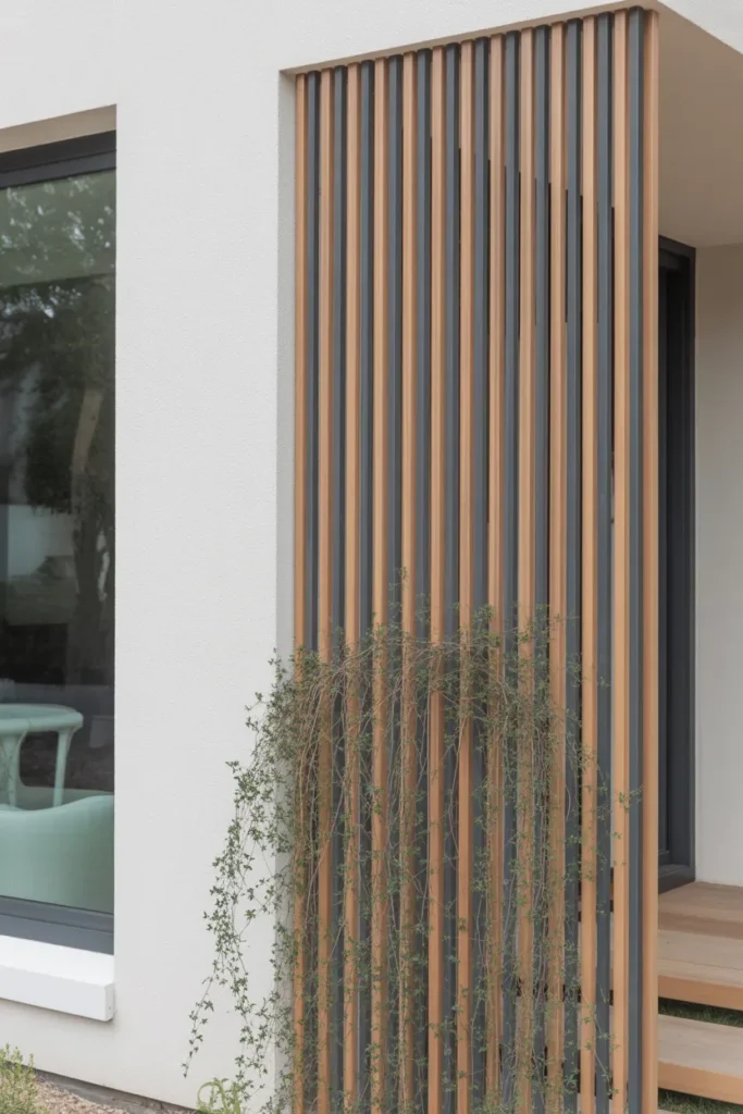 If your exterior feels cold or too “flat,” wood fixes that instantly. A simple grid-style trellis adds warmth without overwhelming the space.